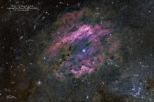 A nebula (‘cloud’ or ‘fog’ in Latin; pl. nebulae, nebulæ or nebulas) is a distinct luminescent part of interstellar medium, which can consist of ionized, neutral, or molecular hydrogen and also cosmic dust. Nebulae are often star-forming regions, such as in the “Pillars of Creation” in the Eagle Nebula. In these regions, the formations of gas, dust, and other materials “clump” together to form denser regions, which attract further matter and eventually become dense enough to form stars. The remaining material is then thought to form planets and other planetary system objects.