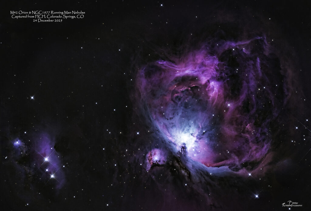 M42 Orion and NGC1977 Running Man Nebula; captured from HCH, Colorado Springs, CO with Big Bertha and ZWO ASI6200MM mono camera, filter wheel with RGB-HSO filters on 24 December 2025