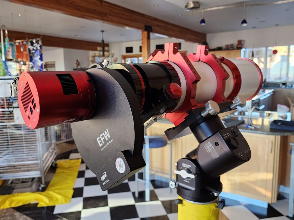 So, I returned it and Paul immediately stepped us up to the $4500 ZWO ASI6200MM full frame mono camera and separate ZWO EFW 7×2″ filter wheel solution. With that set-up there was a one bump along the way to first light, because ZWO’s document leaves a bit to be desired. I was left wondering, once I had the filter wheel assembled, how in the world to attach the camera to the filter wheel to the telescope with the two female-threaded connectors that were “in the box.” I stumbled over that bump (with my go-to helper, YouTube).
