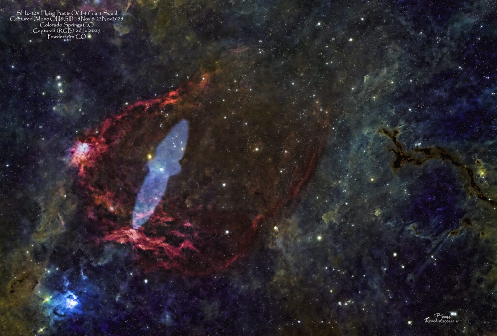 The image that is posted in the gallery (and shown here for those of you who have had the perseverance to read this far!) was created from three session’s data: 1) RGB data from dark skies trip to Tolvar Flats, 26 July 2025; 2) OIII data from both 15Nov and 22Nov to create the blue OU-4 Giant Squid; and 3) SII data from 22 Nov to enhance (richen and darken the color) the red along the outer portions of the SH2-129 Flying Bat. BTW – this image is v3 post the version that I created on 21Nov2024 (which was v2 with the data included to that point) – because I had a hard time coming back to the processed image and not see flaws that I wanted (needed?) to correct. It’s still not as good (glassy-wise in the OU-4), but much better than any other image I’ve produced…and it will get better with more data (which you KNOW I’ll continue to collect)!