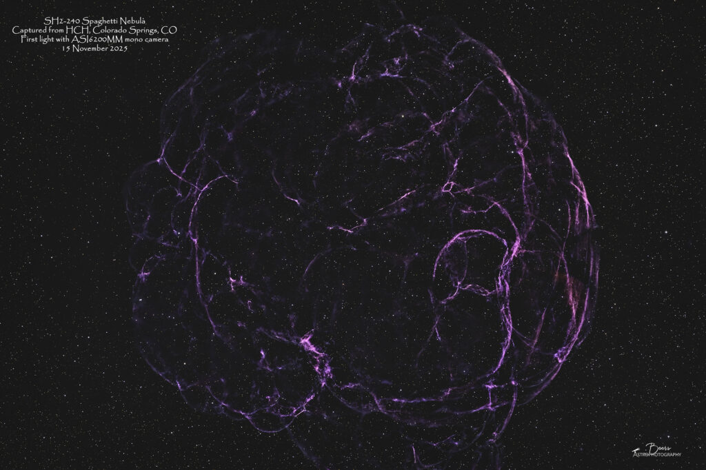 The gallery image is: https://beersastrophotography.com/gallery/sh2-240-spaghetti-nebula/. Please note that this is less than three hours of data spread across three filters, so essentially this is one hour’s worth of data. …and I really have no idea how to process mono data with LR/PS. So…it can only improve; especially as this target moves into full visibility throughout the winter’s longer hours of darkness.